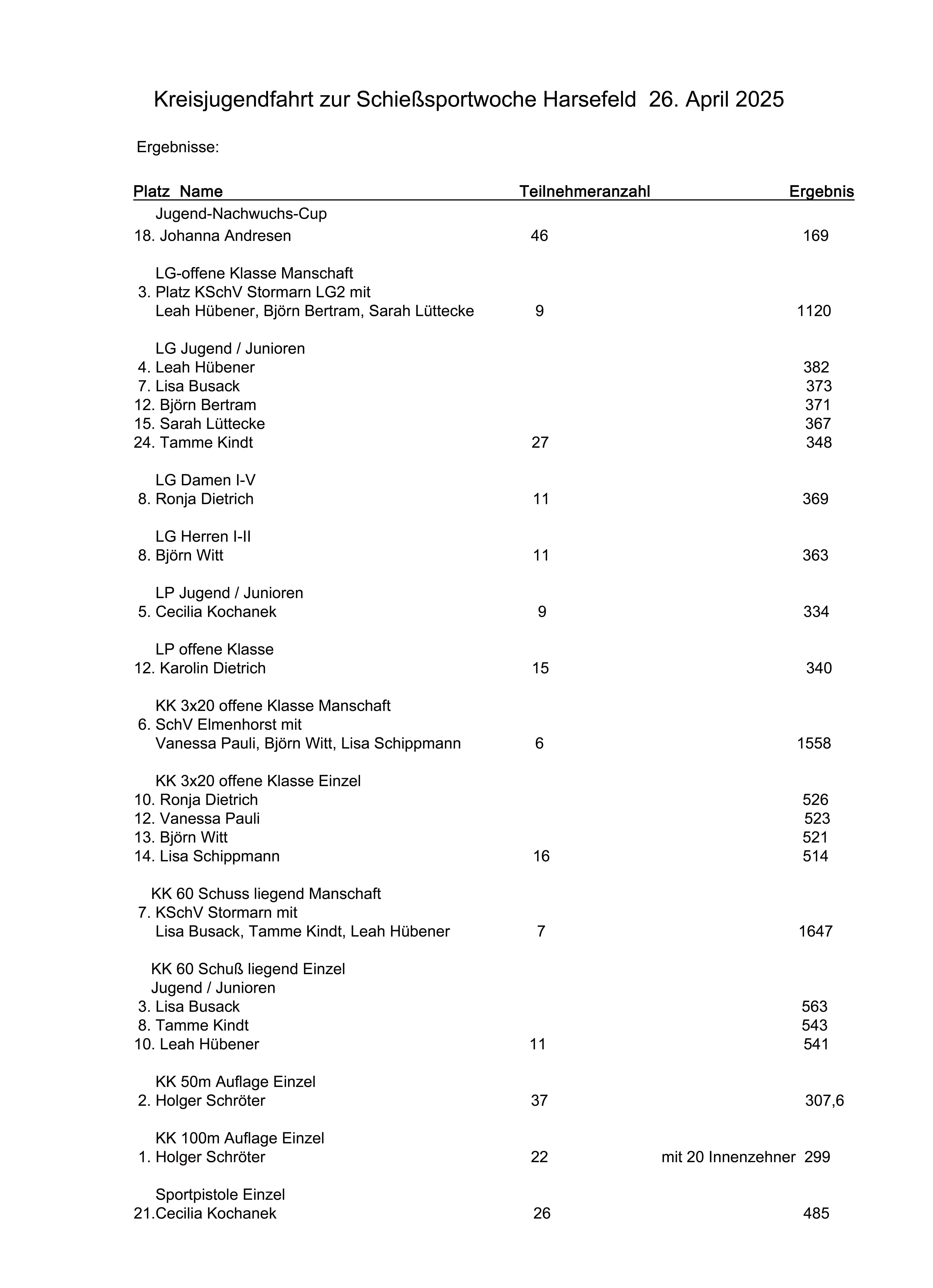 Zuerst wurde mit den Luftdruckdisziplinen gestartet. Dort konnte sich die Mannschaft mit Leah Hübener, Björn Bertram und Sarah Lüttecke den 3. Platz erreichen. Im Einzel ist Leah knapp am Treppchen vorbei auf den 4. Platz gelandet. Außerdem knapp verpasst hat Cecilia Kochanek das Treppchen auf den 5 Platz.